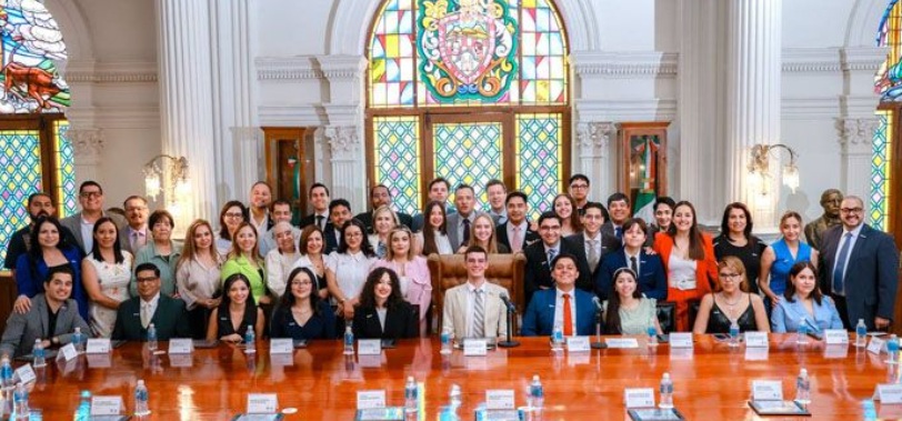 Chihuahua, Chih.- El alcalde Marco Bonilla tomó protesta en sesión de Cabildo, a 23 jóvenes, quienes, frente al Ayuntamiento de Chihuahua, instalaron el “Cabildo Joven 2025” programa donde se capacita a los jóvenes en temas de liderazgo, comunicación, marketing político, democracia, imagen pública y oratoria.