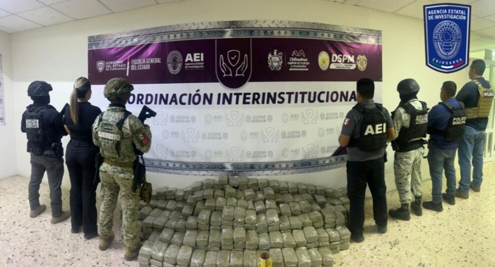 Chihuahua, Chih.- La Fiscalía en conjunto con las diversas corporaciones de seguridad realizaron el cateo de un domicilio la noche del pasado miércoles 10 de septiembre, asegurando alrededor de 300 kilos de marihuana, en la colonia Granjas Cerro Grande.