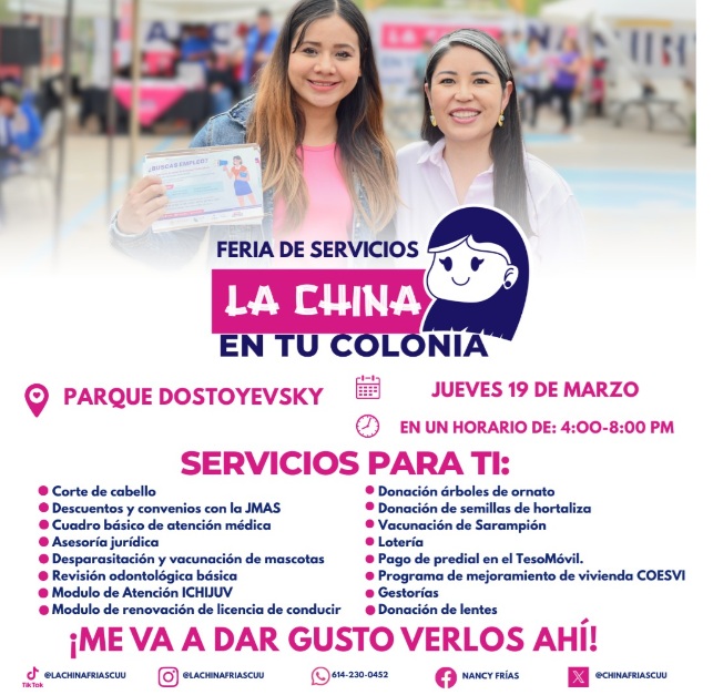 Con el objetivo de acercar apoyos y servicios directamente a las familias, la diputada “La China” Frías anunció la realización de la Feria de Servicios en tu Colonia, que se llevará a cabo este jueves 19 de marzo en el Parque Dostoyevsky, en un horario de 4:00 a 8:00 de la tarde.