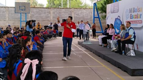 Chihuahua, Chih.- El alcalde Marco Bonilla dio la bienvenida al ciclo escolar en la primaria 24 de Febrero, y realizó la entrega de mochilas del...
